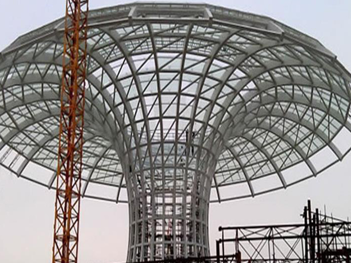 二、球形网架结构因其结构新颖,受力合理,自重轻、用钢量低等优点。如大型体育场馆球形扬州螺栓球网架、公共场馆球形网架、电厂扬州螺栓球网架、水泥工业球形网架、仓储物流球形网架、扬州干煤棚工业球形网架、扬州收费站扬州加油站球形网架、展览中心、影剧院、商场、航站楼、候车厅、工厂扬州车间、仓库、电视塔等球形螺栓球节点网架。国内球形网架结构主要分为:扬州焊接球节点网架及螺栓球节点网架两种。螺栓球节点网架其构件工厂内加工量较大,现场安装便捷,适用于现场工期紧,扬州施工条件、用电量受制约,网架形状复杂、扬州杆件定位困难的异形结构。螺栓球节点球形网架系统基本由扬州杆件、螺栓球、支撑支座等组成。按照节点形式可分为交叉扬州桁架体系、四角锥体系、三角锥体系等。支撑方式多为固定支座支撑。对于大面积、大跨度及有特殊受力或伸缩要求的网架结构可采用橡胶支座、滑移支座、球铰支座等支撑形式,以满足结构自身的受力稳定、均衡,便于内力释放等设计要求。